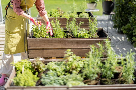 Woman is planting vegetables and herbs in raised bed. Fresh plants and soil.