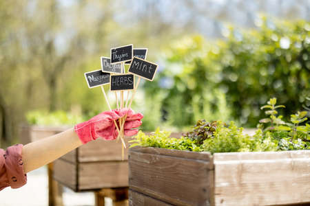 Woman holding wooden plates with inscriptions of plant names with growing herbs on background, close-up. Growing spicy herbs and design of name plates concept
