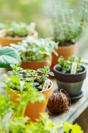 Home gardening, growing herbs in terracotta pots on windowsill
