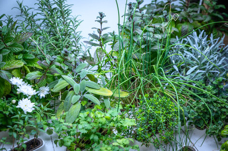 Various organic herbs in a clay pots on the balcony, mint, basil, rosemary.