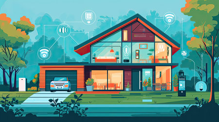 Smart home technology automation network security energy control modern digital connection. modern house surrounded by interconnected smart