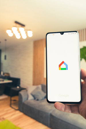 February 17, 2021, Barnaul, Russia: Google home smart control of light and heating in the apartment through the app on your smartphone.