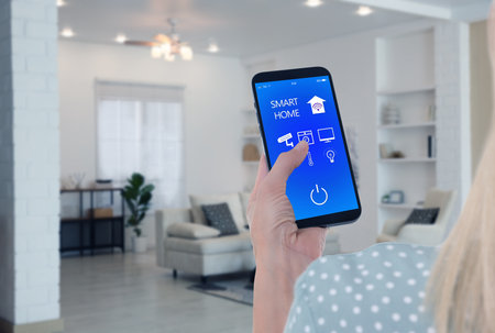 Woman using app on mobile phone to control house features in room, closeup