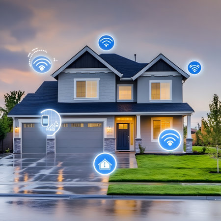 A modern house illuminated at dusk showcases advanced smart home technology with digital connectivity.
