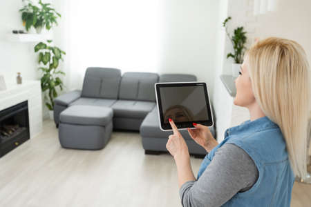 Intelligent home concept. Young woman using smart home application on a tablet