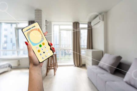Smart home control on phone. Phone in woman hand. Living room interior in background
