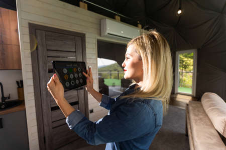 woman holding a tablet with the smart home application in a glamping dome tent domestic