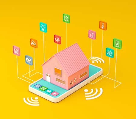 Smart home pastel color. Concept of house technology system with wireless centralized control on yellow background. Isometric 3d rendering