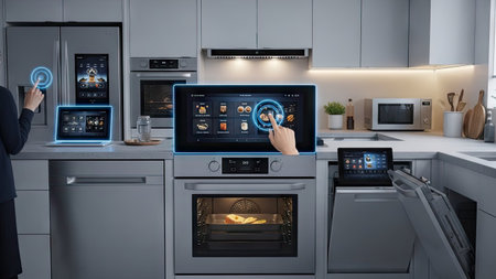 A sleek kitchen displays advanced smart appliances with touchscreen controls and an interactive panel.