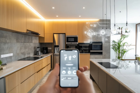 A person operates smart kitchen appliances using a mobile device in a sleek and modern kitchen design with wooden cabinets.
