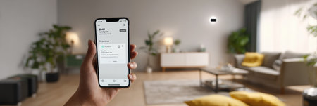 Hands hold a device with a smart home control interface, symbolizing the seamless connection between technology and home automation. AIG41