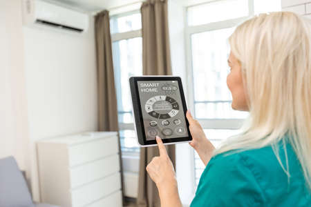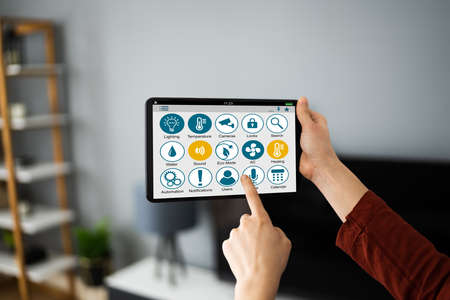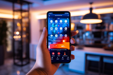 Smart home control featuring temperature and lighting control. Modern automation with wireless connectivity. Home technology with convenient control and energy efficiency. Focus is on an intelligent system and a smart life.