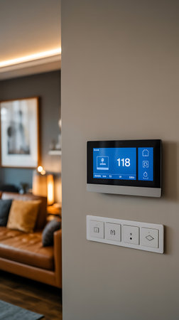 Sleek smart home control panel on living room wall displaying connected devices and climate settings