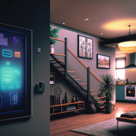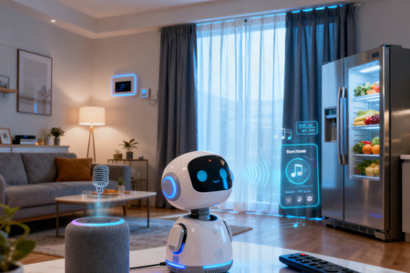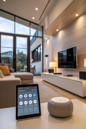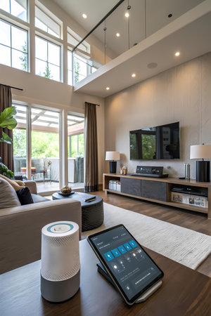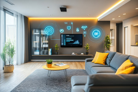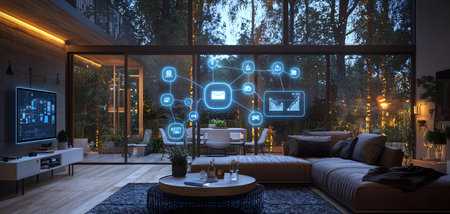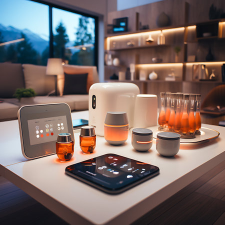 Smart home with interconnected devices showcasing advanced technology in a cozy, modern living space.