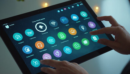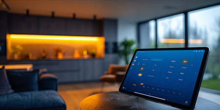 Tablet displaying smart home control interface in a modern living room with a warm ambient lighting.
