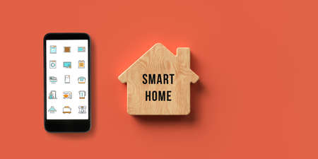wooden house symbol with message SMART HOME and smartphone with tech symbols on orange background