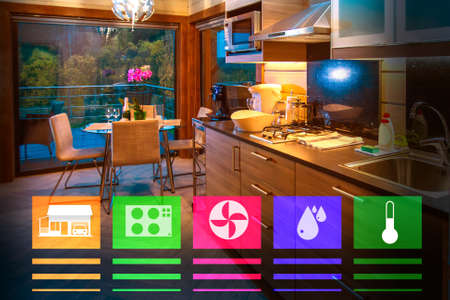 Apartments are equipped with smart home technology. Smart home symbols on cottage interior background. Concept - household appliances of this house are controlled remotely. Remote monitoring of smart home