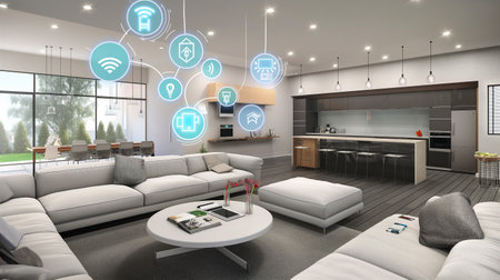 Modern living room integrated with smart technology and open kitchen design. The interior features a spacious living area with sleek furniture and smart home icons. Technology background. Generative AI