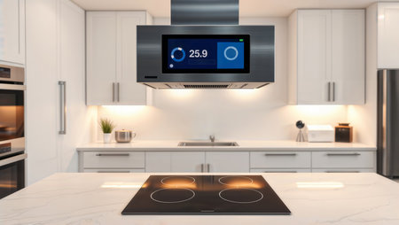 Modern kitchen technology. Sleek contemporary kitchen interior with smart range hood display and illuminated induction cooktop on marble island.