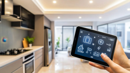 A person using a tablet to control smart home features in a modern kitchen. This image showcases technology integration in home design and convenience.