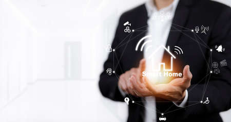 Businessman touch smart home automation assistant on a virtual screen and the user touches a button. technology interface on smartphone app screen with augmented reality (AR) Internet of Things view.