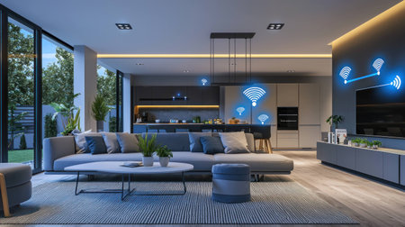Modern smart home interior with Wi Fi connectivity, showcasing a stylish living space designed for comfort and technology, featuring natural light and greenery