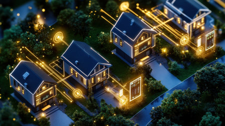Night aerial view showcasing three connected smart homes Illuminated houses display digital interfaces highlighting IoT technology and home automation capabilities within a lush green suburban setting