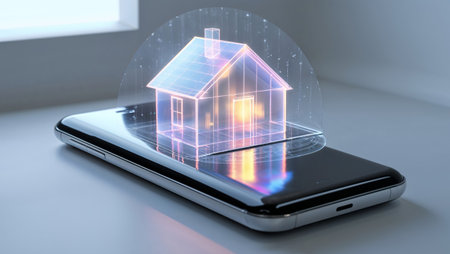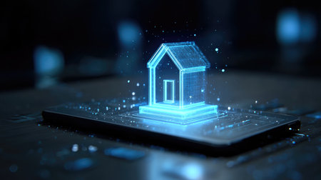 This image illustrates a digital concept of smart home technology, featuring a transparent house icon superimposed on a smartphone screen, symbolizing modern innovation.