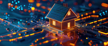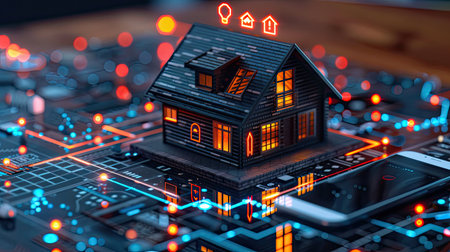 A conceptual smart home glows atop a digital motherboard, symbolizing modern connectivity and automation.