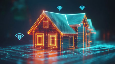 Modern glowing digital house with an orange frame against a blue-green tech-themed background, Wi-Fi signals glowing around it.