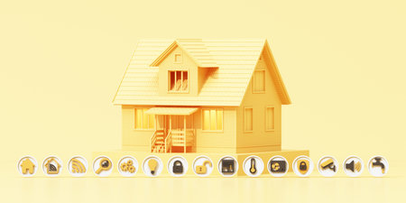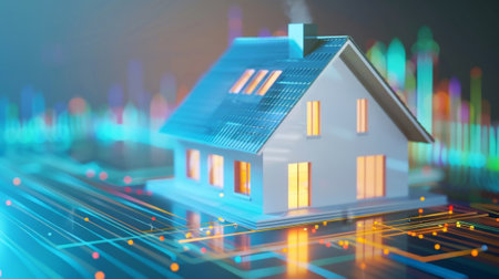 A digital image showcases a small house model with glowing windows. It is set against a dark backdrop, and a network-like design with connecting dots surrounds it. The illustration uses blue and yellow hues with soft lighting, suggesting a technological or conceptual theme. Suitable for various editorial and commercial applications.