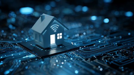 A miniature house with a WiFi symbol sits on a circuit board, symbolizing smart home technology and connectivity in a digital age. Focus on innovation and the future of living.