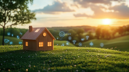 A wooden house model surrounded by smart home icons on a lush green grass field, with a sunrise in the background, illustrating the concept of connected living.