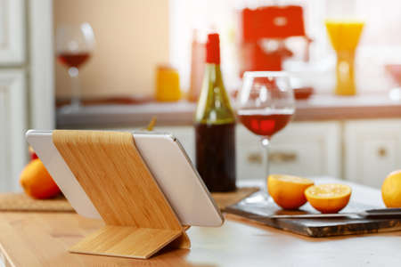 Foods to cook from the digital recipe virtual online master class tutorial using touch tablet while cooking healthy food in the kitchen at home.
