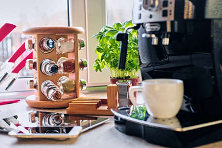 Professional coffee machine for home use and communication set of smart watch, tablet PC and smart phone.