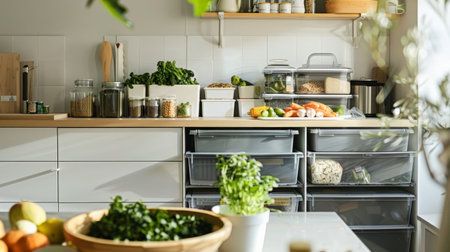 A well-organized kitchen with neatly arranged pantry items, clean countertops, and stylish storage solutions, emphasizing practical and aesthetic design.