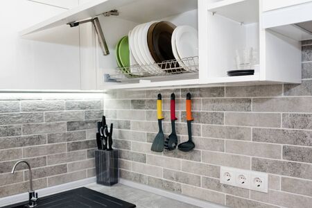 Kitchen interior with utensils on shelves. Modern kitchen.