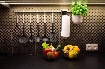 Vegetables, fruits and herbs in a contemporary kitchen.