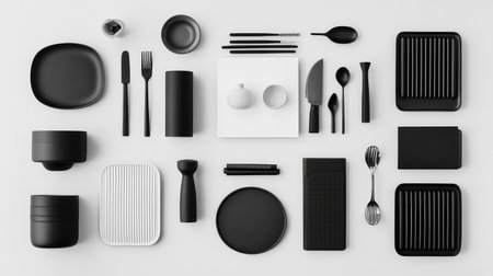 Black and white kitchenware elegantly displayed against a neutral backdrop showing simplicity and style. A.I.