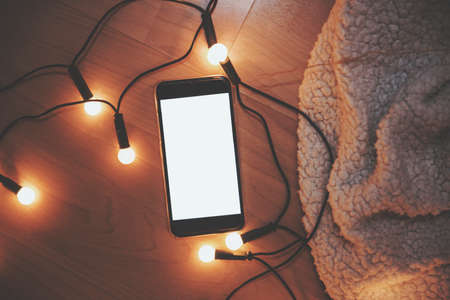 Man holding mobile phone in front of festive Christmas backdrop. Mobile software advertisement, screen space for design and text copy