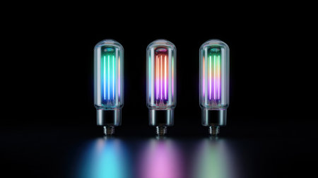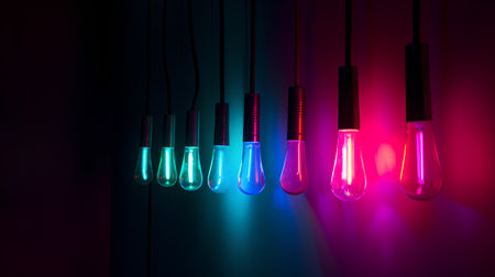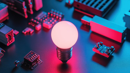 A vibrant light bulb radiates a captivating glow, surrounded by various electronic components. The neon colors create an engaging visual experience.