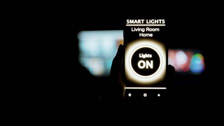 Close up shot of man holding a smartphone in hands with a smart light application on it
