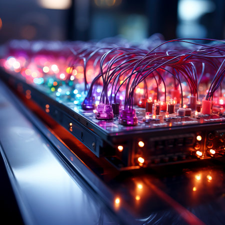 A close-up shot showcasing vibrant colorful lighting effects on electronic components. The image features an abstract play of light and color, ideal for technology themes.