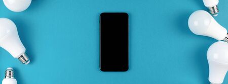 Energy-saving and eco-friendly life in conceptual frame pattern. Creative top view flat lay of LED light bulbs and modern smartphone mockup composition with copy space on blue background minimal style