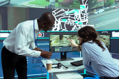 African american supervisor gives instructions to his staff in finding gps coordinates on satellite map, guiding couriers through CCTV surveillance footage. Order tracking and locating.