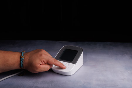 A person uses a digital blood pressure monitor on a concrete table, turning it on to start the measurement, showing health care and home care in action