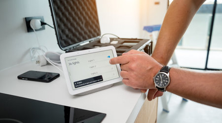 Guy uses his smart light application to turn on the light bulbs in the house. Smart future technology