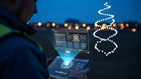 A scientist holds a smartphone interacting with a glowing holographic tree displaying digital...
