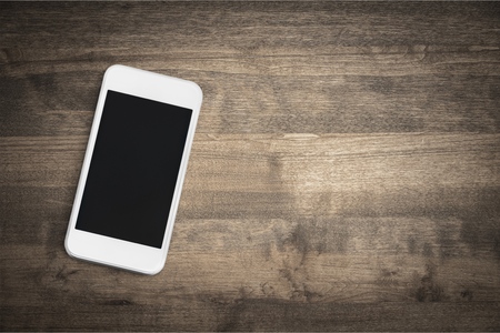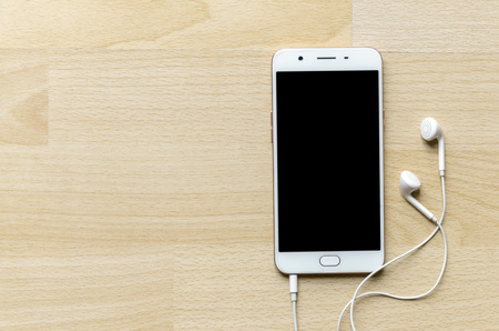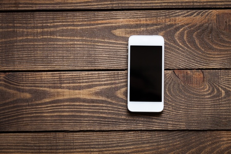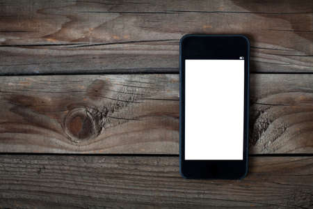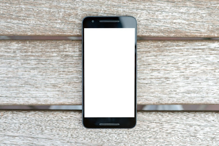 Modern blank white smartphone template on wooden background.Isolated blank under cell phone moccap