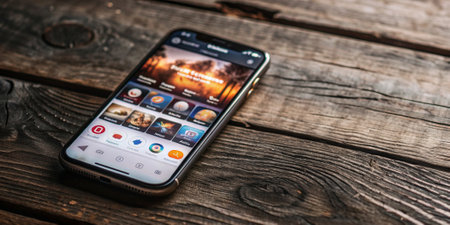 Modern black smartphone showing a beautiful sunset wallpaper, placed on a textured rustic wooden surface. Minimalist tech and decor.